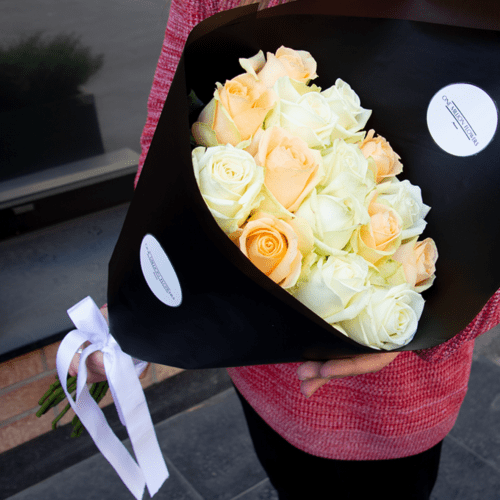 Этот аранжированный букет включает в себя 7 штук нежно-кремовых роз и 8 штук изумительно-белых роз. Они создают гармоничное сочетание цветов, добавляющее стиль и роскошь в композицию. Высота каждого цветка достигает 40 см, позволяя каждому словить дыхание этой уникальной красоты.