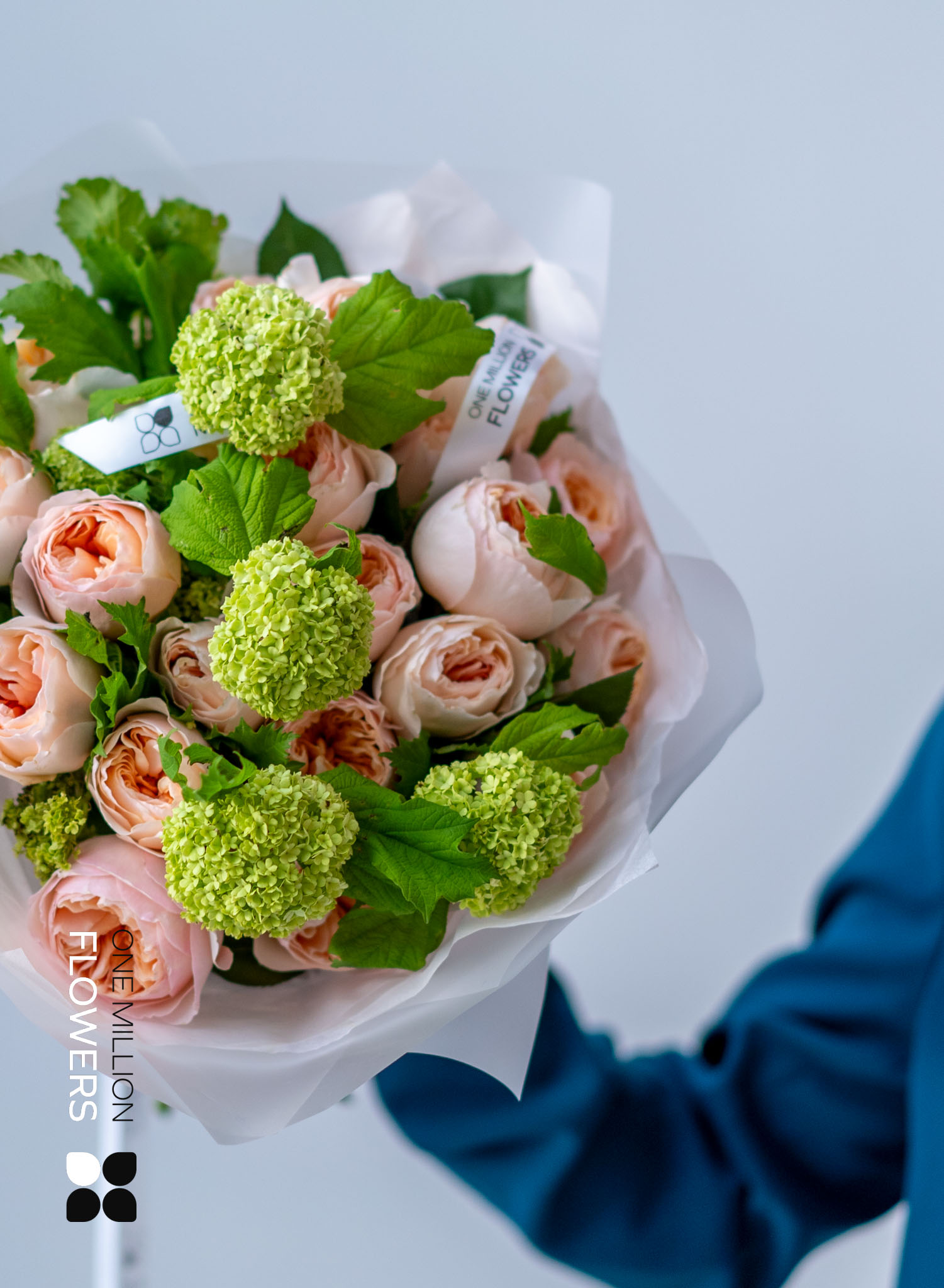 Букет Duo "Джульет Виб" включает в себя три изысканных веточки вибурнума и двадцать одну пионовидную розу сорта Дэвид Остин Джульетта. Этот великолепный цветочный ансамбль объединяет в себе нюансы нежности и стиля, придавая любому моменту особое значение.