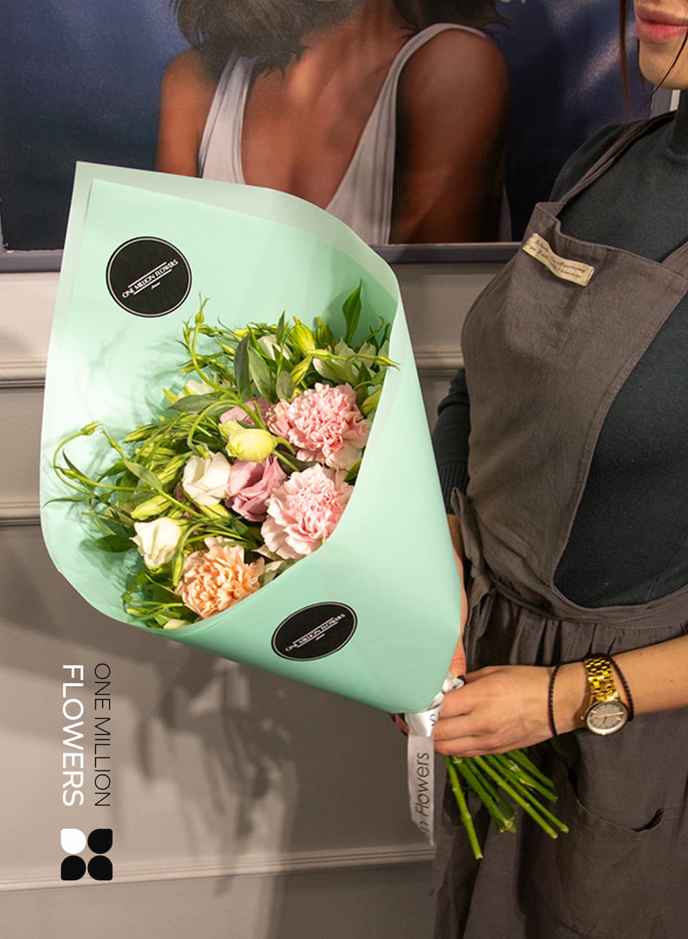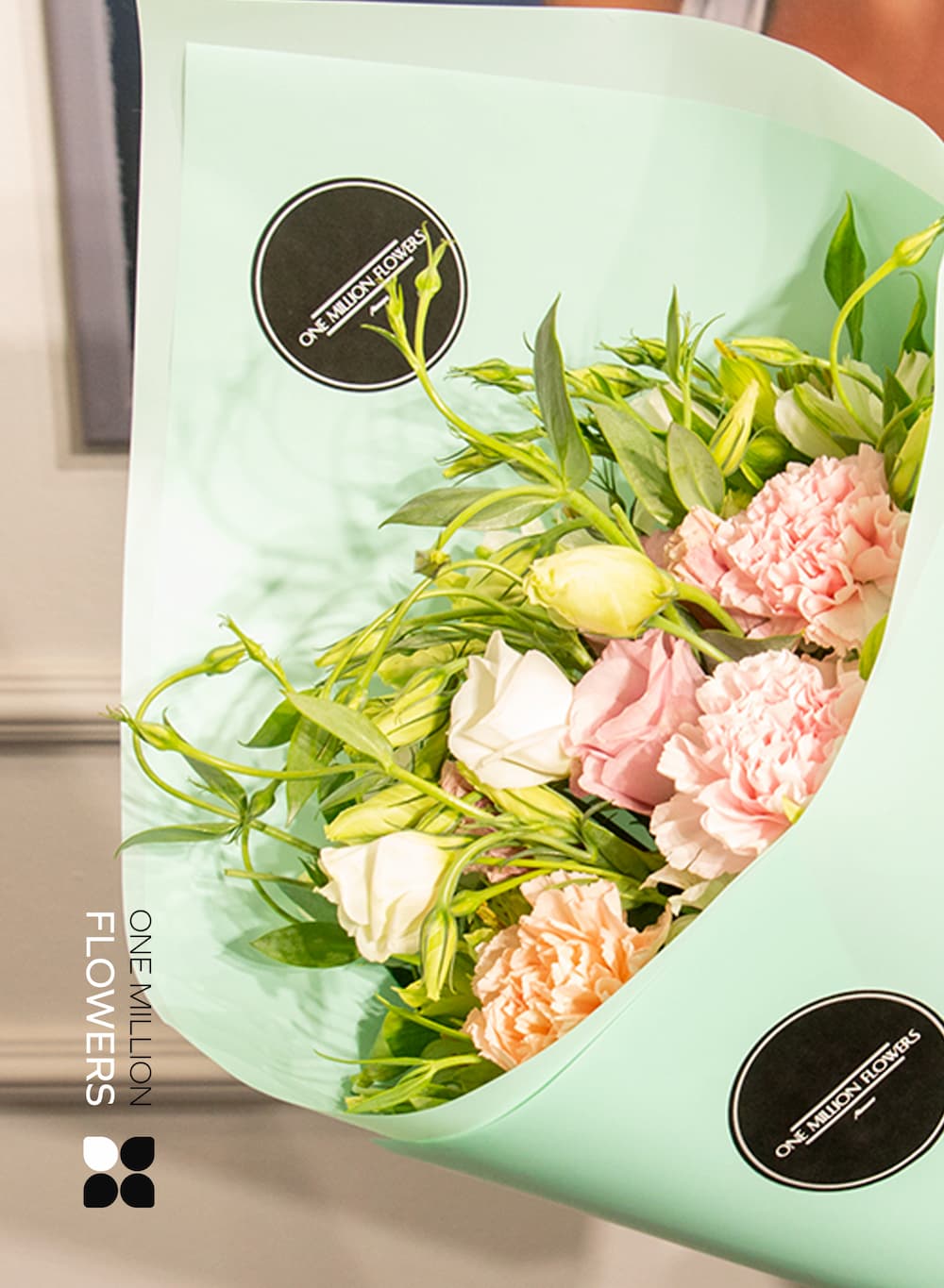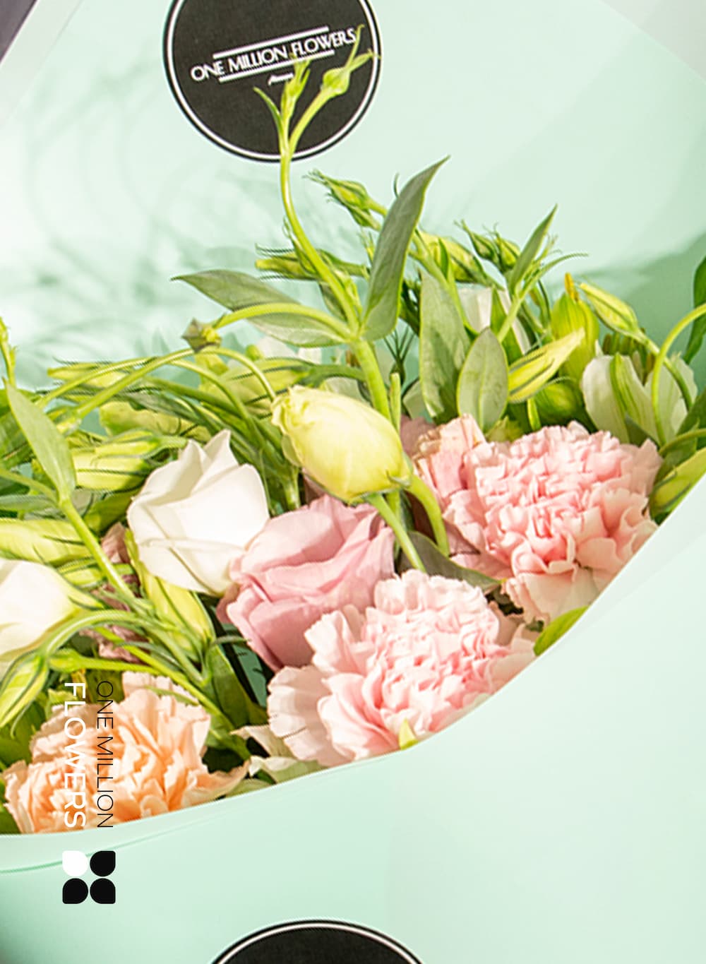 Каждый цветок тщательно отобран для создания этого особенного ассортимента. Эустомы передадут элегантность и чистоту, а диантус добавит непосредственности и румянец в ваше жизнь или жизни вашего получателя. Обратите внимание на то, что мы предлагаем данный букет за особую цену только до конца этой недели. Не упустите возможность порадовать себя или близких свежими и красивыми цветами.