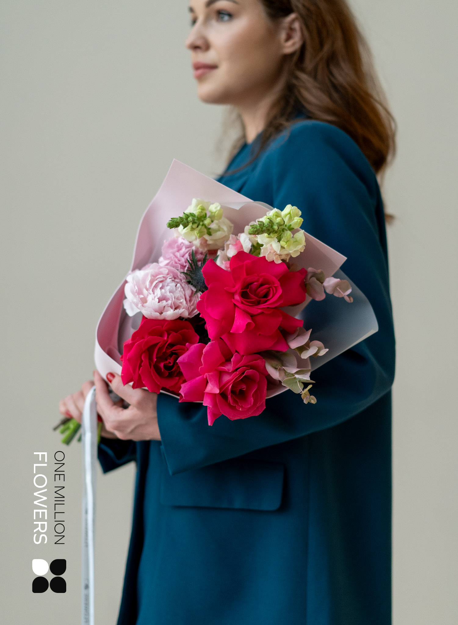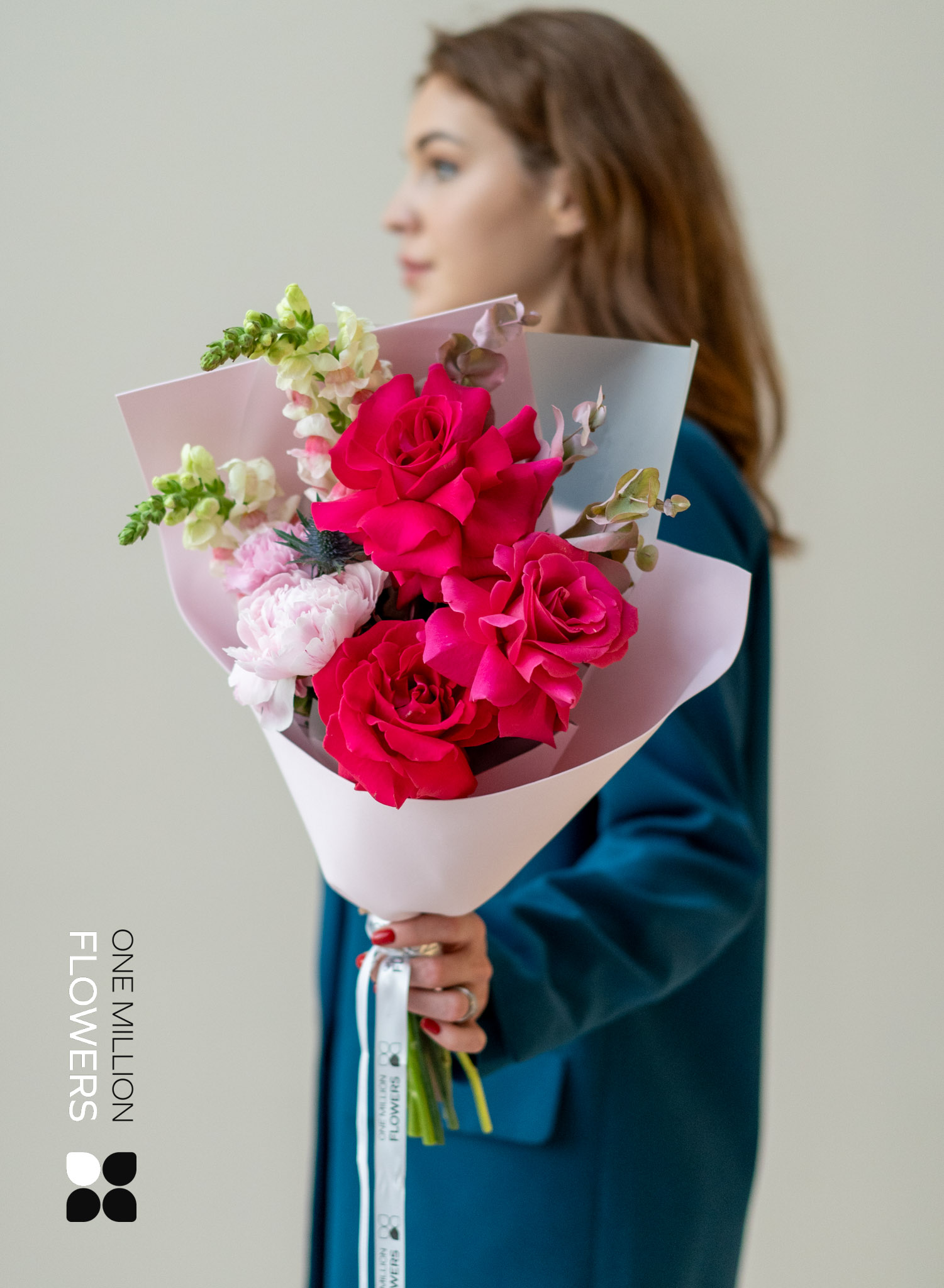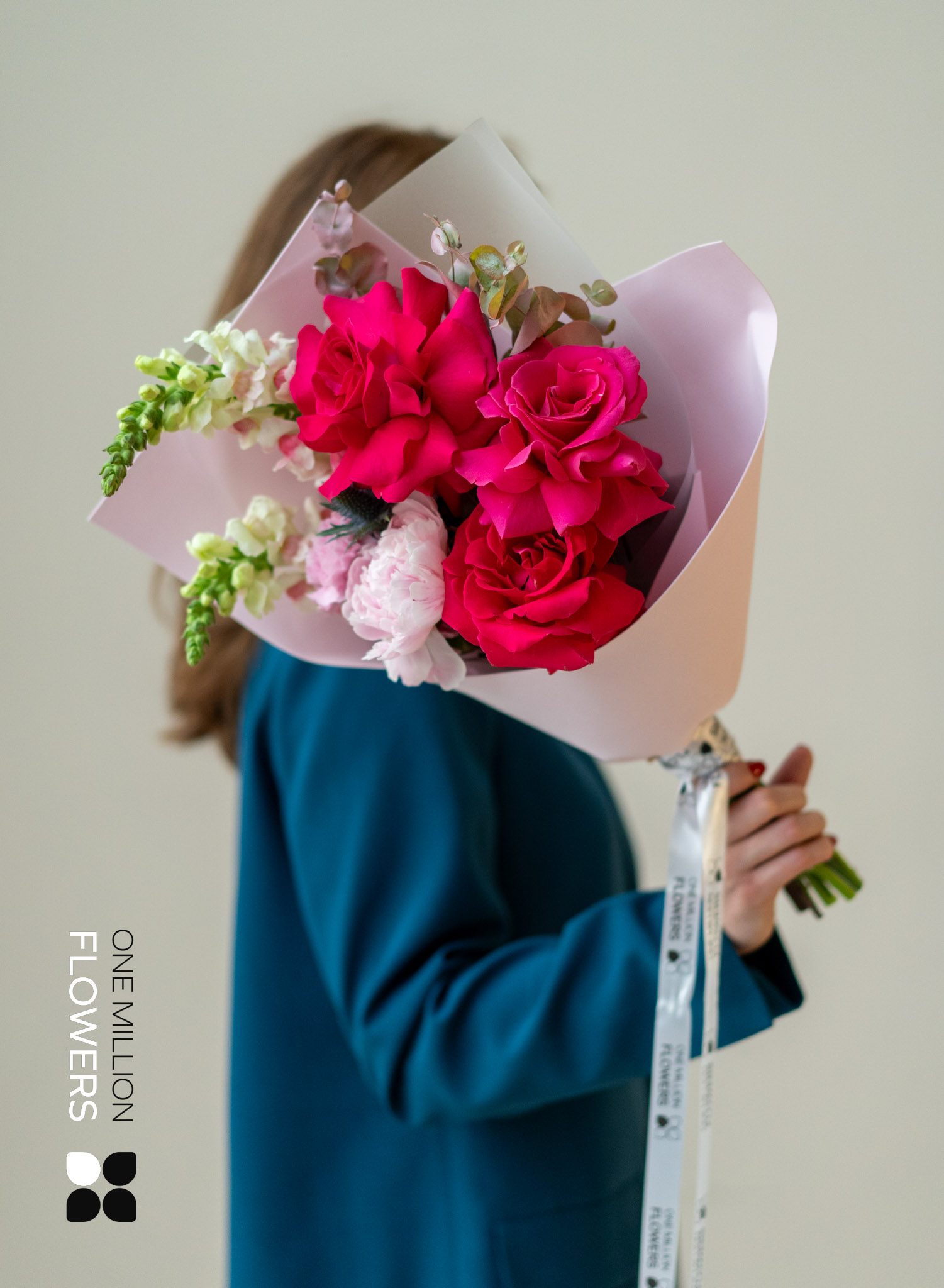 Букет "Флойд Х Сара" — это нежная композиция, в которую входят три розы розового цвета из Эквадора "Пинк Флойд", один пион розового оттенка, две гвоздики (диантус) и один эвкалипт. Также в букете вы найдёте два антиррина и один эрингиум, которые добавляют текстуры и интересной зелени, создавая яркую и живую картину.