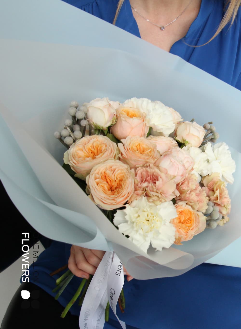 Этот букет — истинное произведение искусства, которое комбинирует в себе нежные оттенки и текстуры, создавая атмосферу уюта и любви.