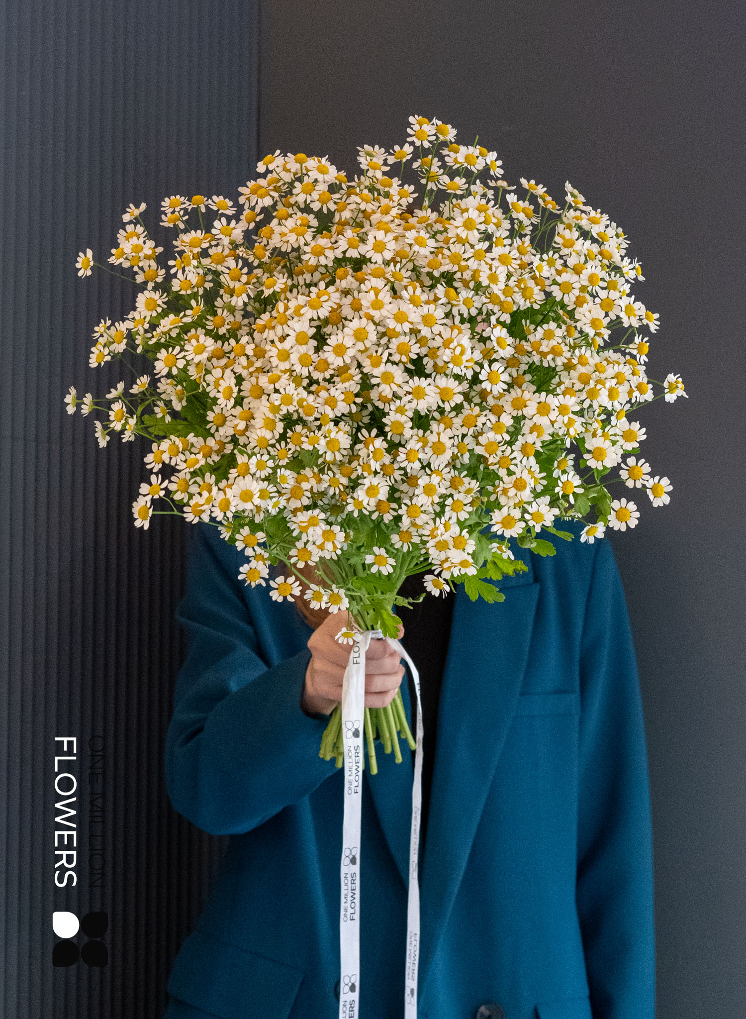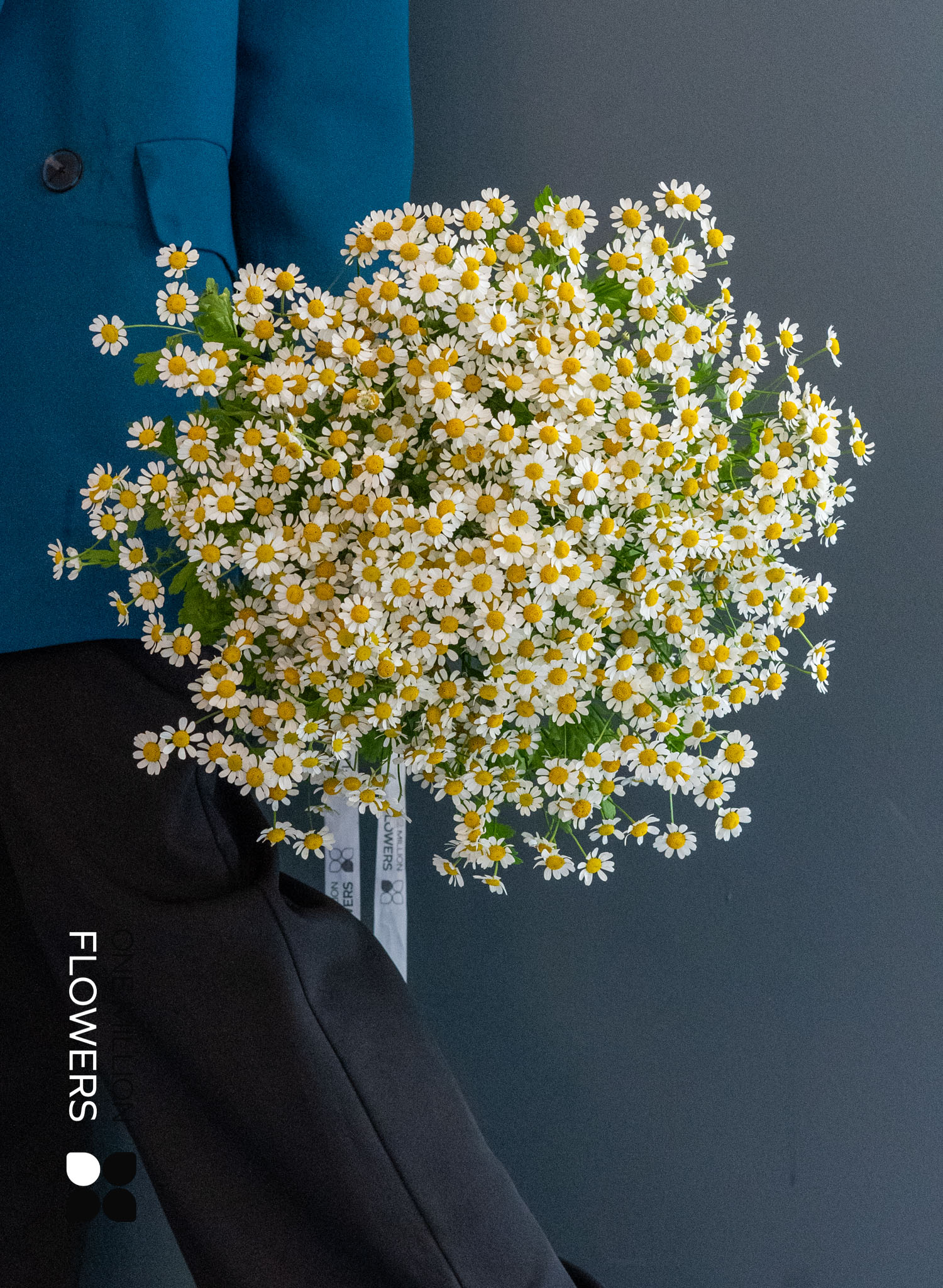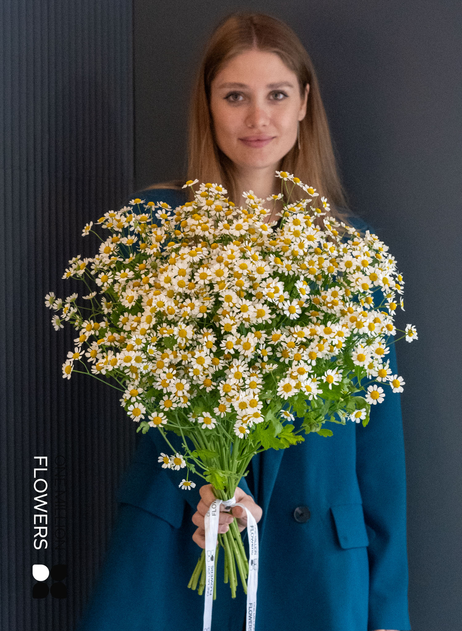 Букет состоит из 25 свежих ромашек (танацетум). Мы отбираем только самые лучшие экземпляры, чтобы гарантировать свежесть и долговечность букета. Каждая ромашка, попадающая в наш букет, проходит строгий отбор, чтобы вашим близким достался только самый жизнерадостный и нежный подарок.