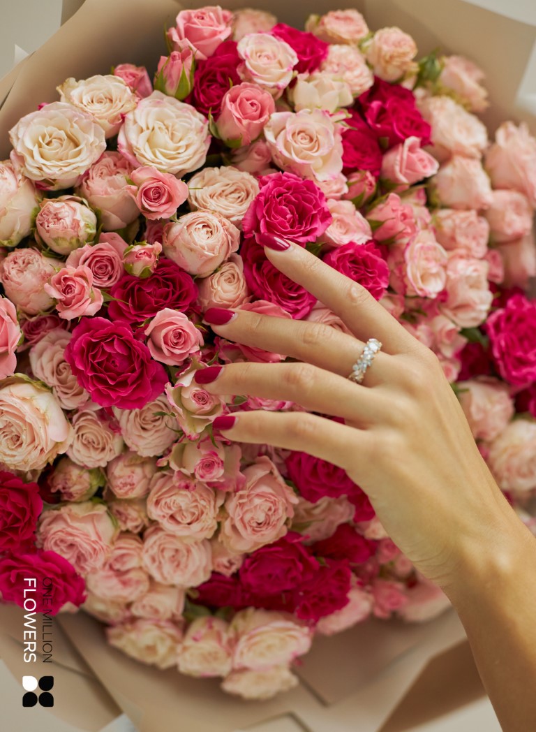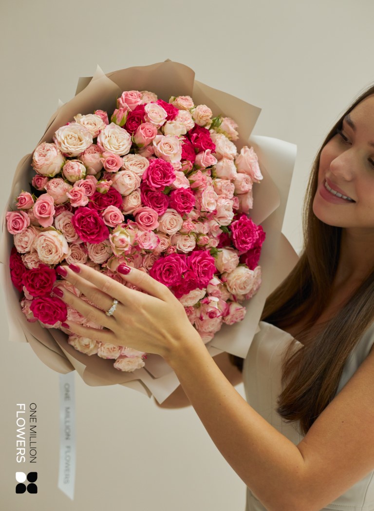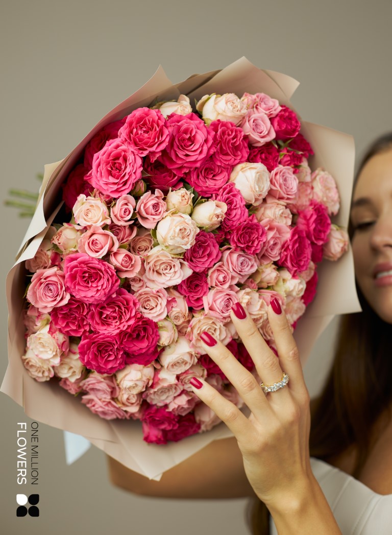 Букет состоит из 51 кустовой розы, каждая из которых привносит в композицию свою уникальность и изящество. В состав входят: - Роза кустовая Рефлекс (кремовая) — 11 шт. - Роза кустовая Натали (розовая) — 15 шт. - Роза кустовая Лианна (малиновая) — 11 шт. - Роза кустовая Бомбастик Кремовый (нежно) — 14 шт.