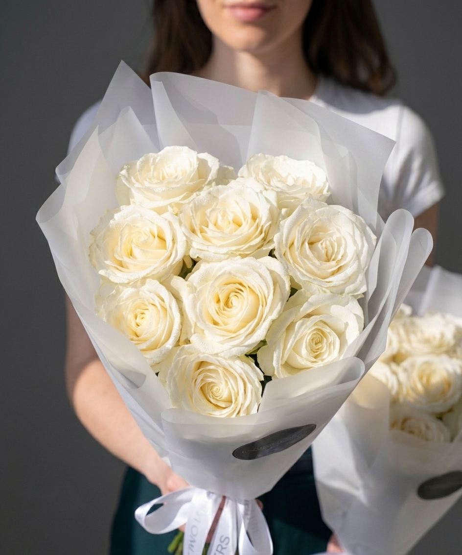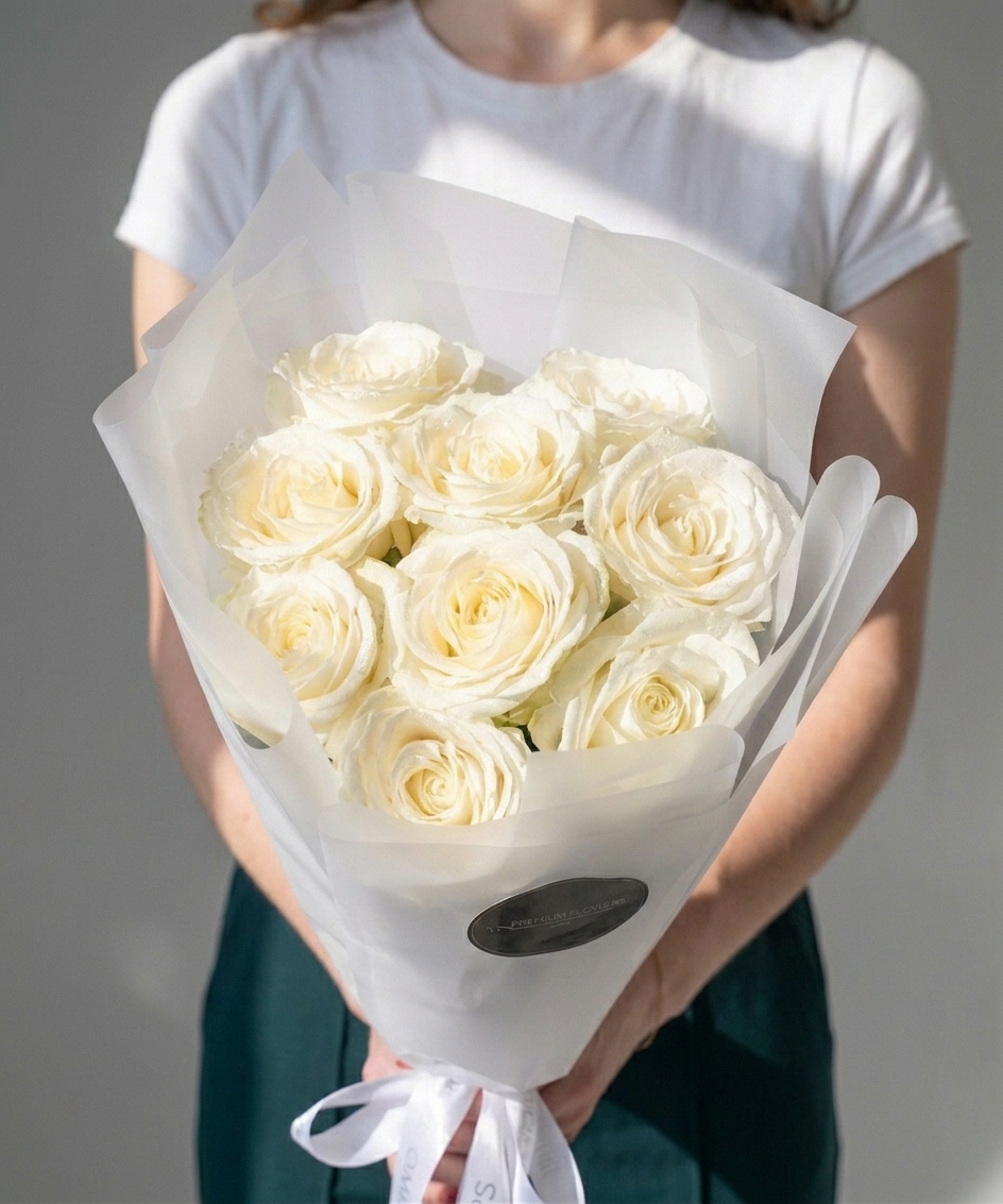 Букет из 9 "Аваланш" Mate - Высотой 40 см. включает в себя 9 прекрасных белоснежных роз аваланш, высотой 40 см каждая.