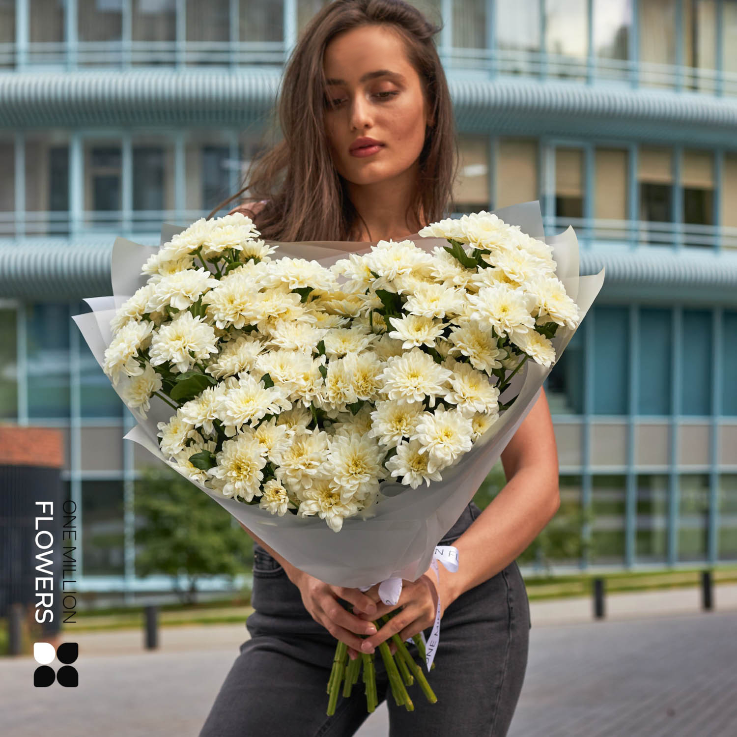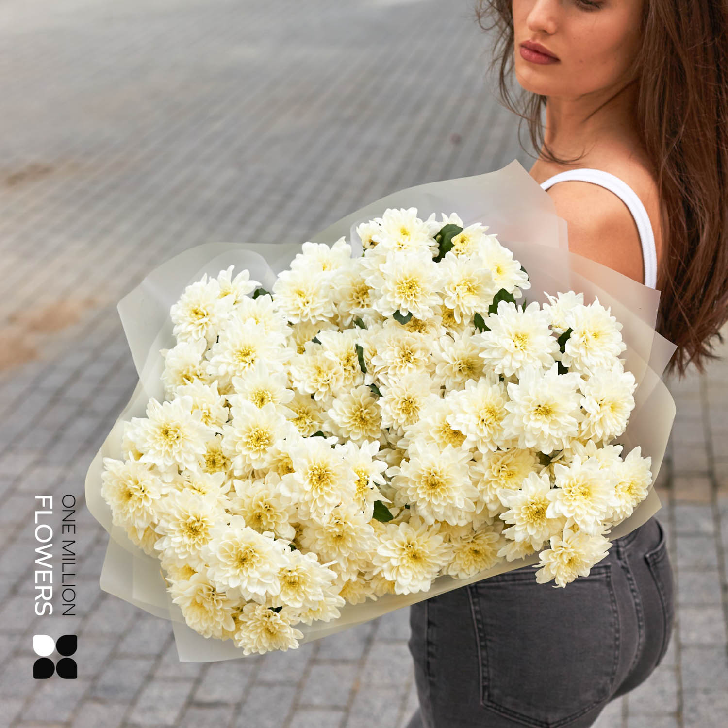 Букет из кустовых изысканных кустовых хризантем Валди это тысячи снежных лепестков красоты.