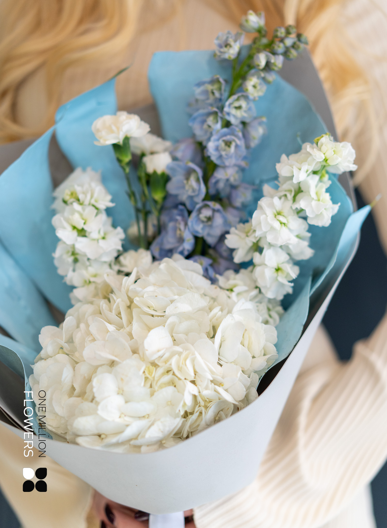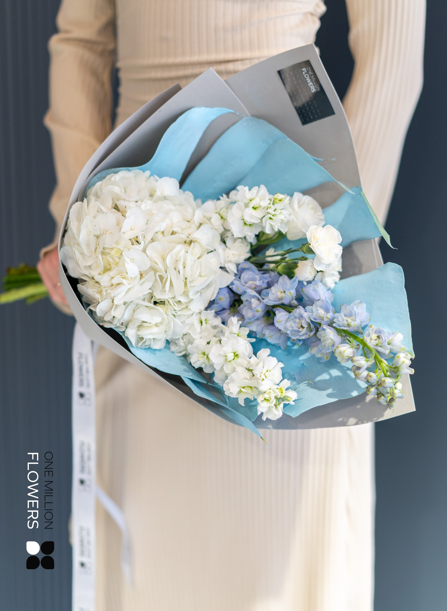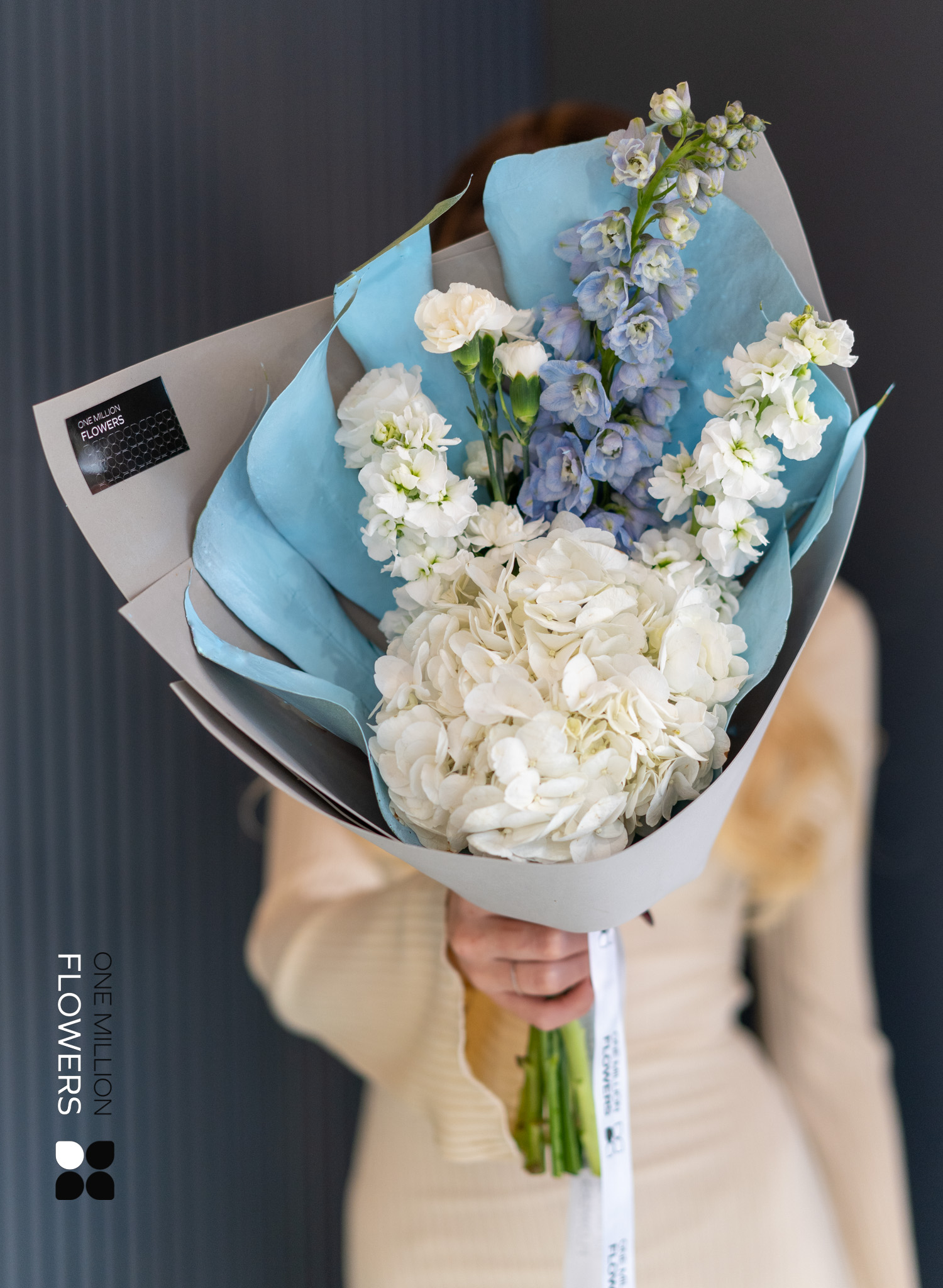Букет "Кой Дели" Grey — это воплощение утонченной красоты, собранное из тщательно подобранных цветов. Он включает в себя 1 шт. кустового диантуса (гвоздики) белого, 1 шт. белой эустомы, 1 шт. монстеры, 2 шт. маттиолы белой, 1 шт. дельфиниума и 1 шт. белой гортензии. Каждый цветок в этом букете создает гармоничное сочетание, подчеркивающее его изысканный стиль и свежесть.