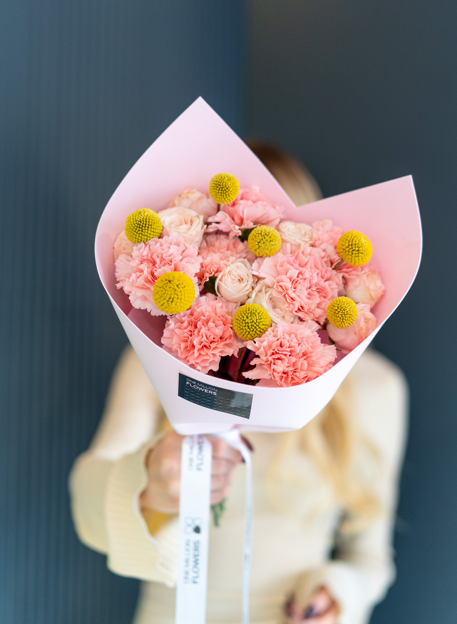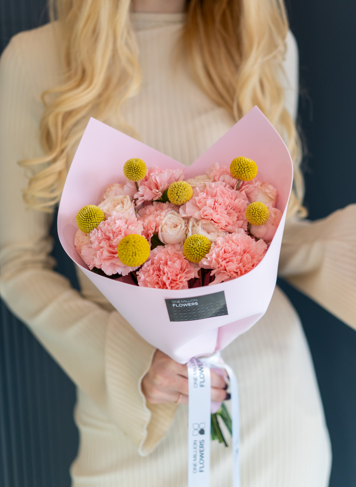 Этот восхитительный букет сочетает в себе изысканность и свежесть. В его состав входят: диантус розовый (гвоздика) – 7 шт., роза кустовая Бомбастик кремовый – 2 шт., краспедия – 7 шт. Такой разнообразный состав создаёт гармоничное цветовое сочетание и интересную текстуру, что делает его идеальным для самых торжественных случаев.