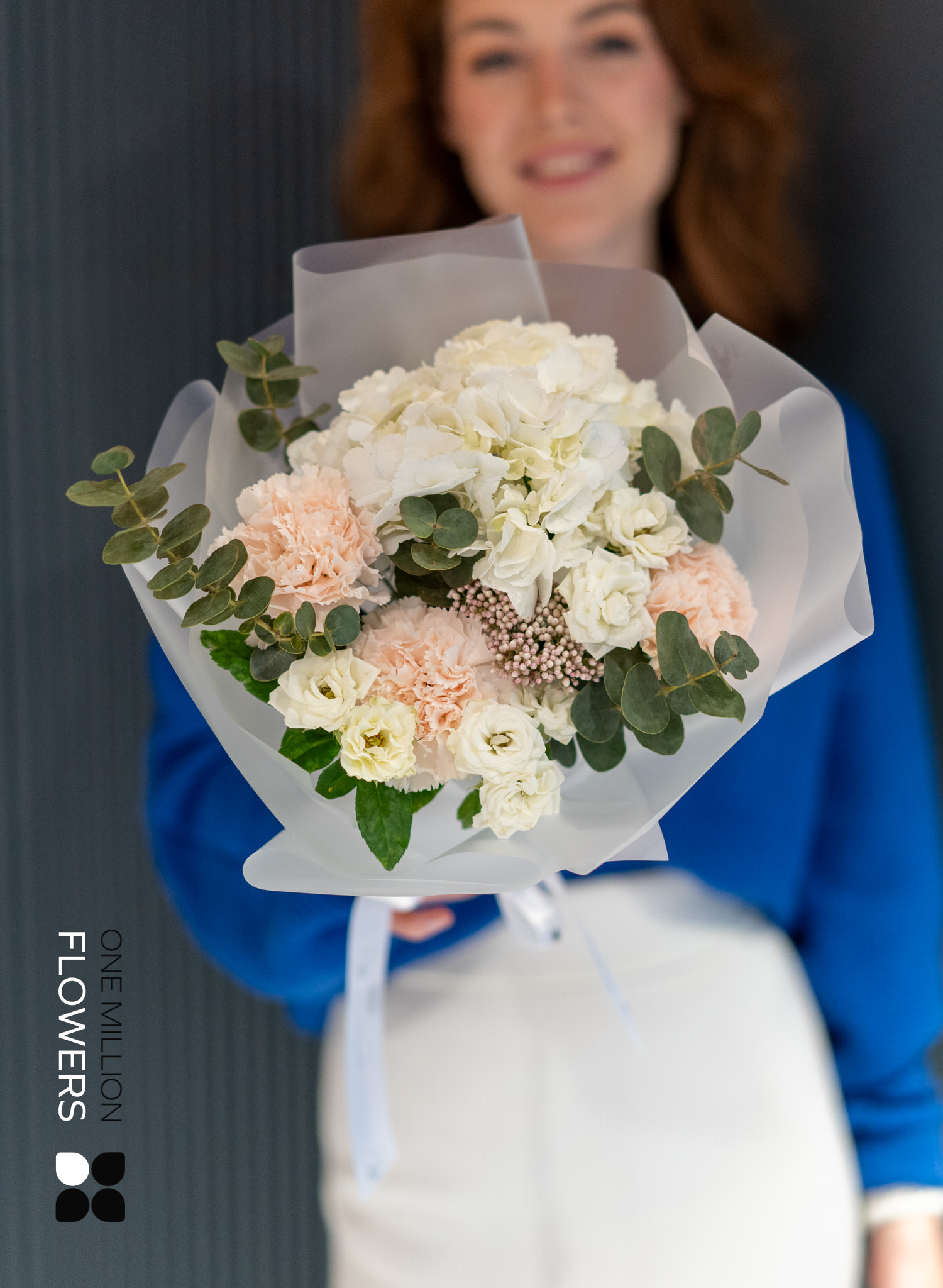 Букет "Сноу Креман" Mate — это великолепное сочетание нежности и элегантности. В его состав входят 3 кремовых диантуса (гвоздики), 1 ветка эвкалипта, 3 белые кустовые розы Сноуфлейк, 1 озатамнус и 1 белая гортензия. Благодаря такому разнообразию текстур и оттенков, букет выглядит утончённо и привлекательно, идеально подходя для любого особого случая.