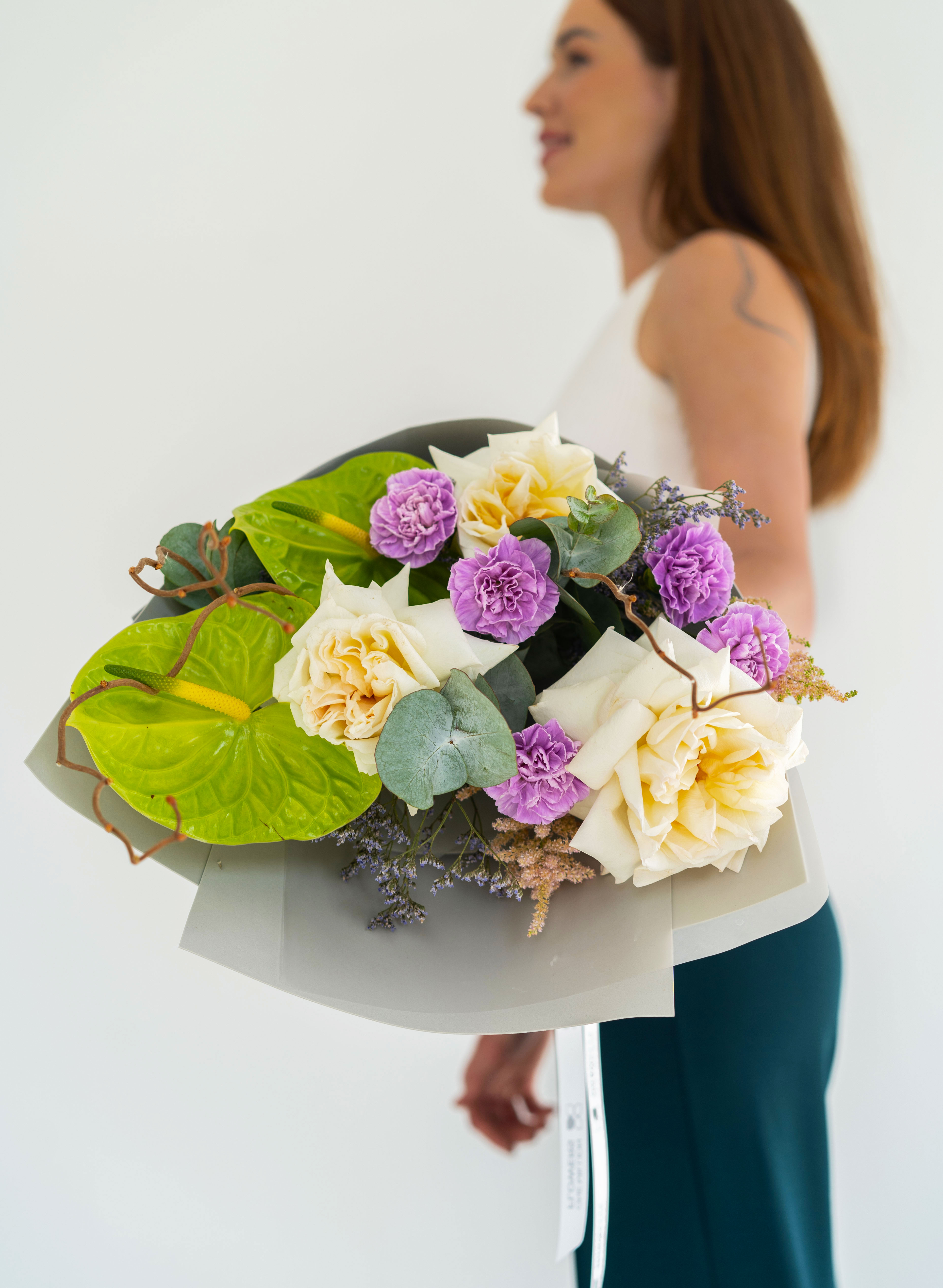 Изысканный и утонченный букет "Охара Концепт" Grey — это гармоничное сочетание классики и современного стиля. Нежные пионовидные розы "Вайт Охара" с их молочно-белыми лепестками создают основу композиции, дополняясь сиреневым диантусом и воздушным лимониумом. Элегантный антуриум добавляет выразительность, а веточки эвкалипта и корилиуса придают легкость и свежесть. Астильба завершает композицию, наполняя ее невесомостью. Этот букет подойдет для стильного подарка, подчеркивая утонченность и изысканный вкус получателя.