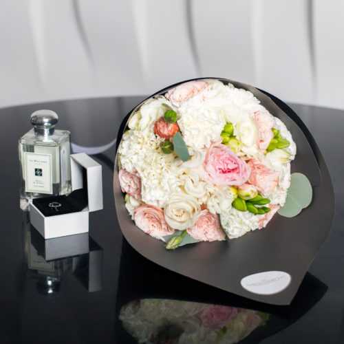 Составляющие этого изумительного букета олицетворяют различные качества человеческой природы. Пионовидная роза Пинк Охара символизирует любовь и привязанность, а кустовая роза Бомбастик Кремовый (нежно) олицетворяет чистоту и невинность. Грациозная фрезия добавляет комфорта и свежести, а диантус передает пожелание удачи и успеха. Наконец, белая эустома шепчет о магической красоте некоторых мгновений.
