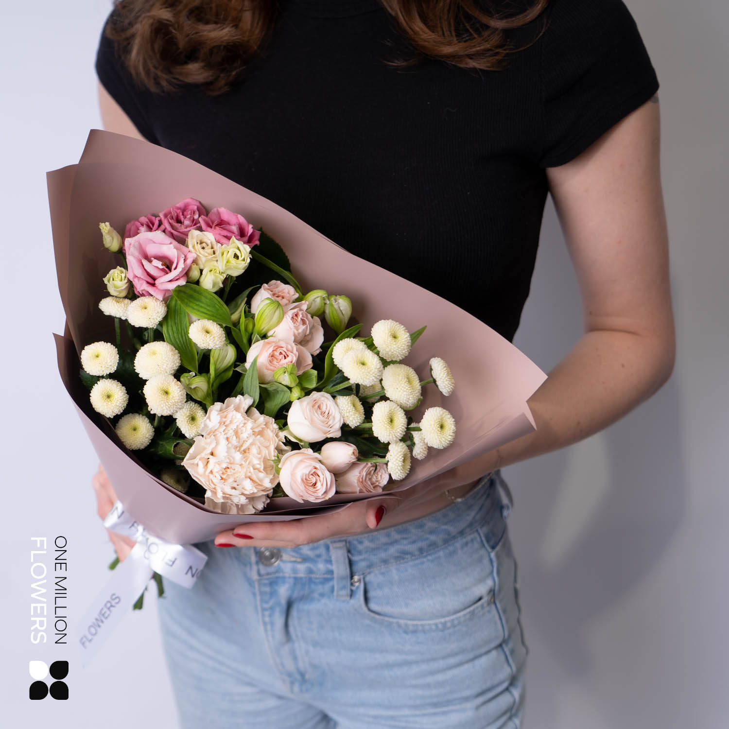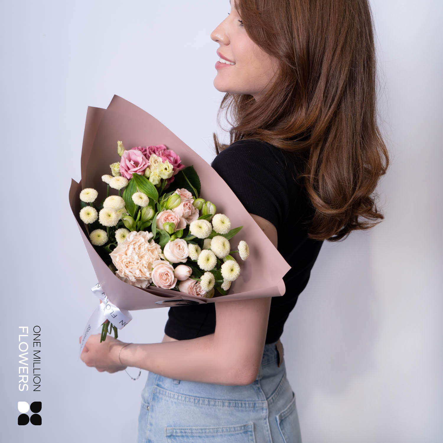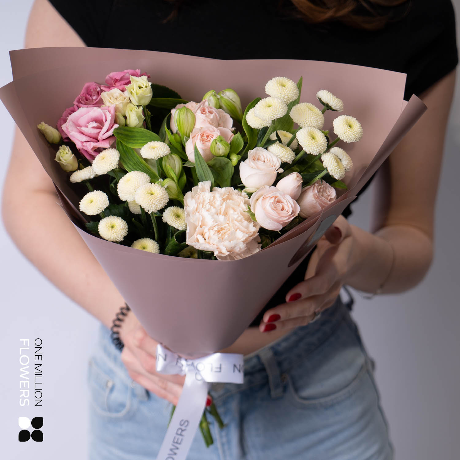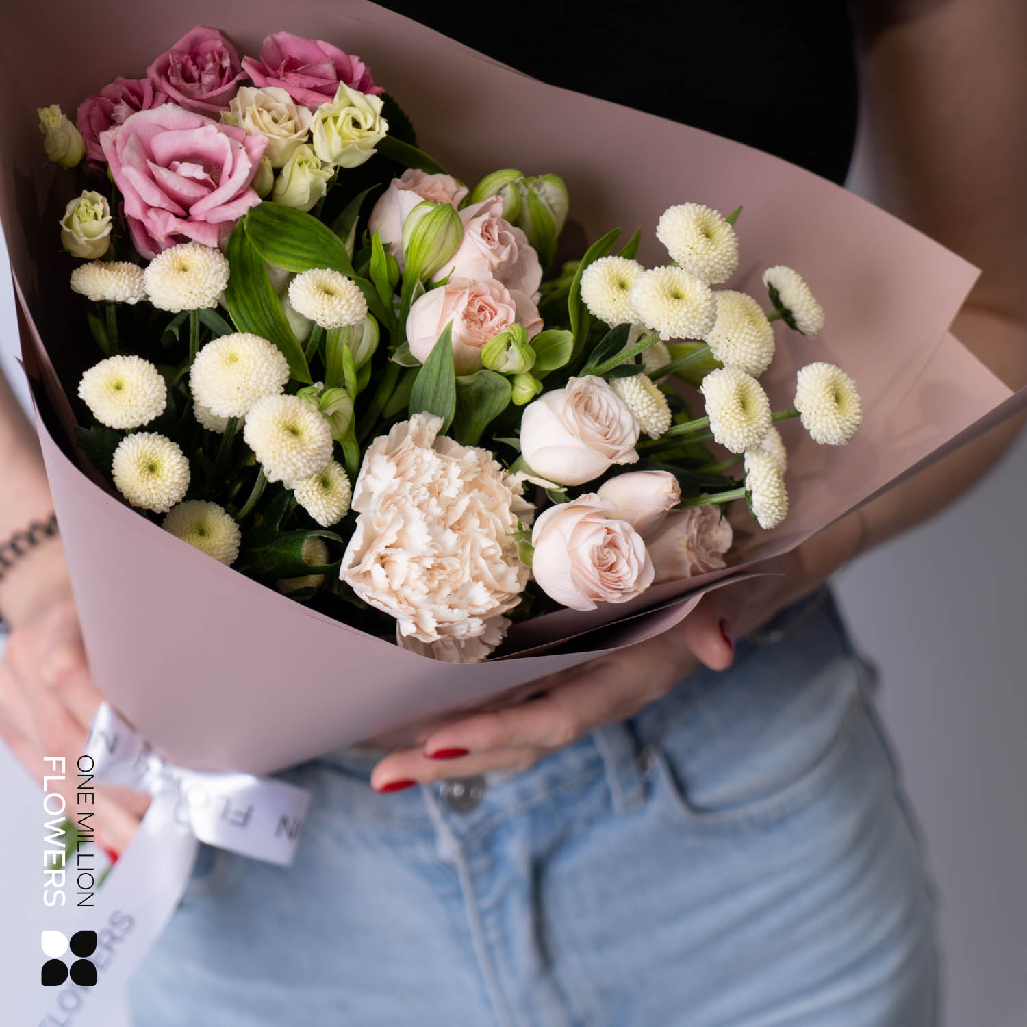 "Помпон Лайт" — это изящный и сбалансированный букет, в котором главную партию играют пышные соцветия в нежно-розовой и кремовой гамме. Воздушные текстуры напоминают лёгкие облака, создавая ощущение праздника и лёгкости. Букет собран вручную флористами One Million Flowers, чтобы стать достойным украшением особенного момента.