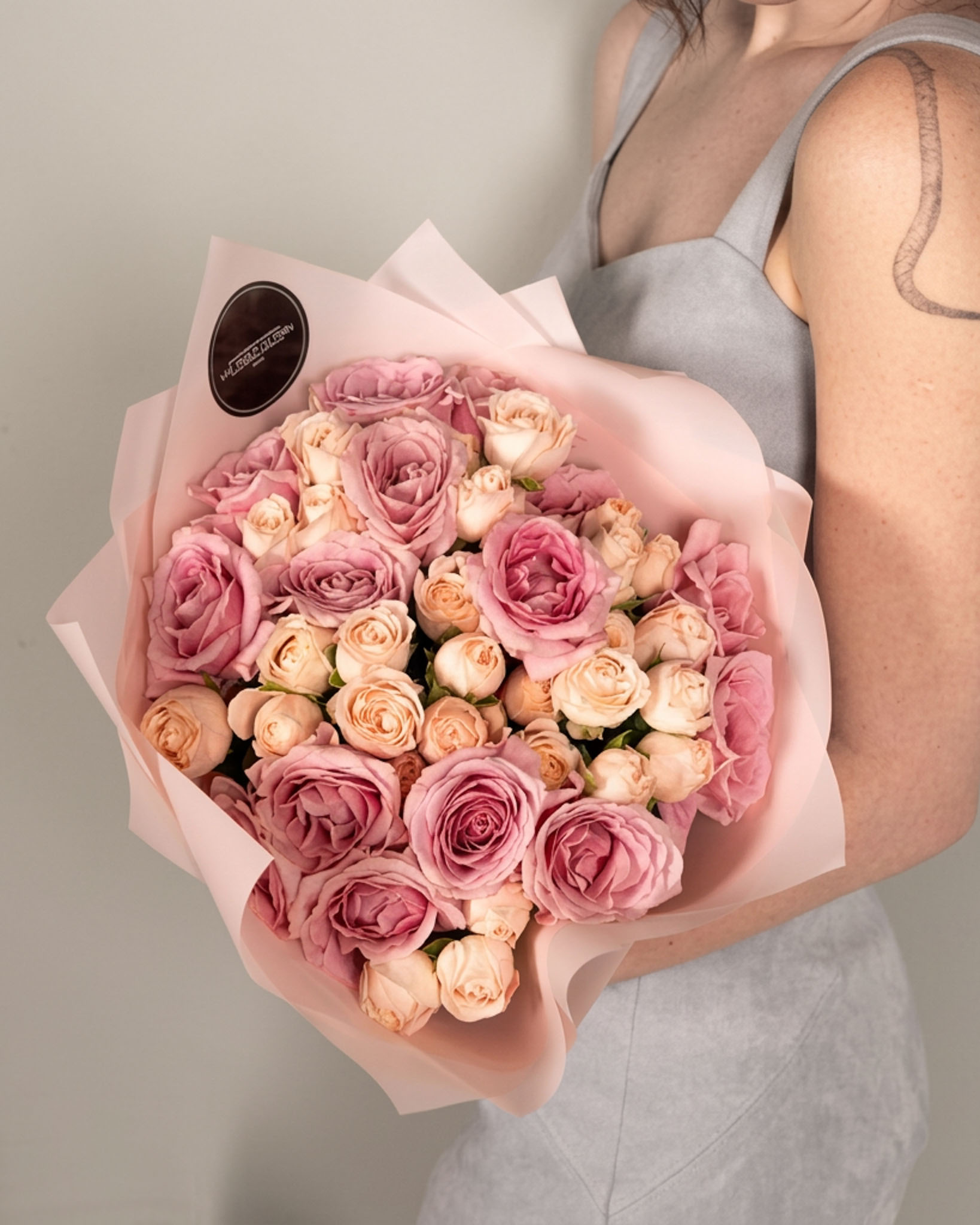 Букет "Рона Мар" Pink поразит своей нежностью и шармом. Он является удачным сочетанием 10 штук кустовых роз Бомбастик Кремового (нежно) и 15 штук очаровательных рожковых роз с мягким оттенком фирменного цвета Pink.