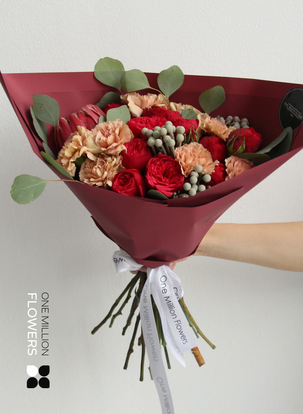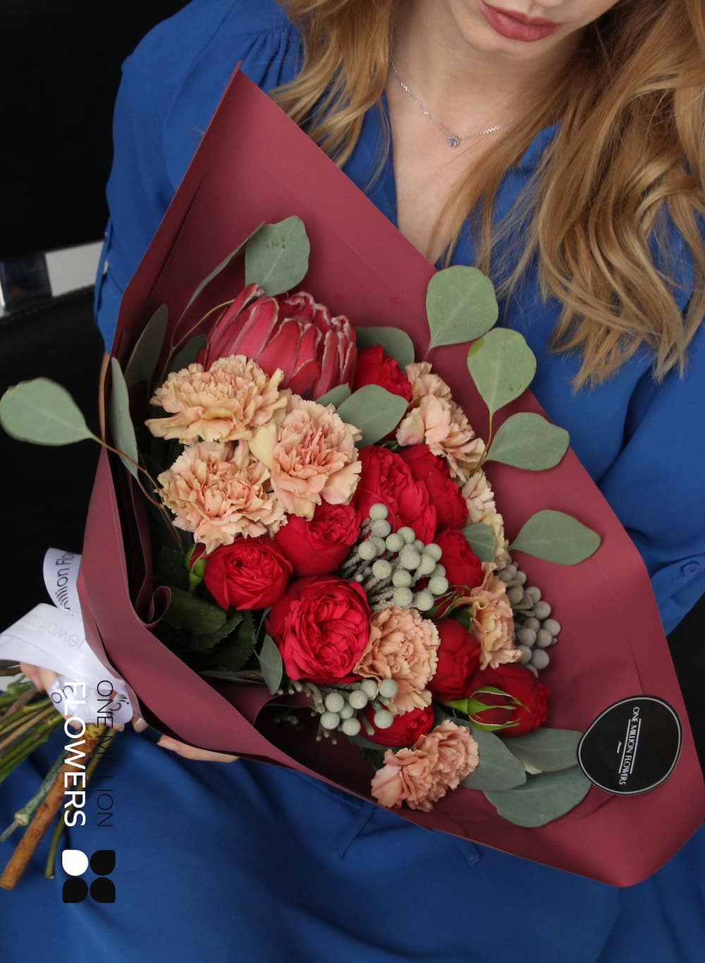 Букет включает в себя следующие прекрасные цветы: - Диантус кремовый (Гвоздика) — 9 шт. - Пионовидная роза Ред Пиано (Рэд) — 5 шт. - Эвкалипт — 3 шт. - Протея — 1 шт. - Бруния — 2 шт.