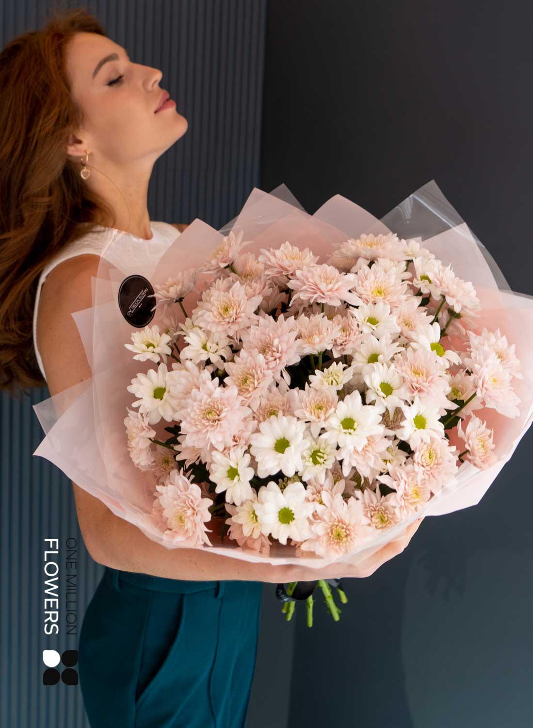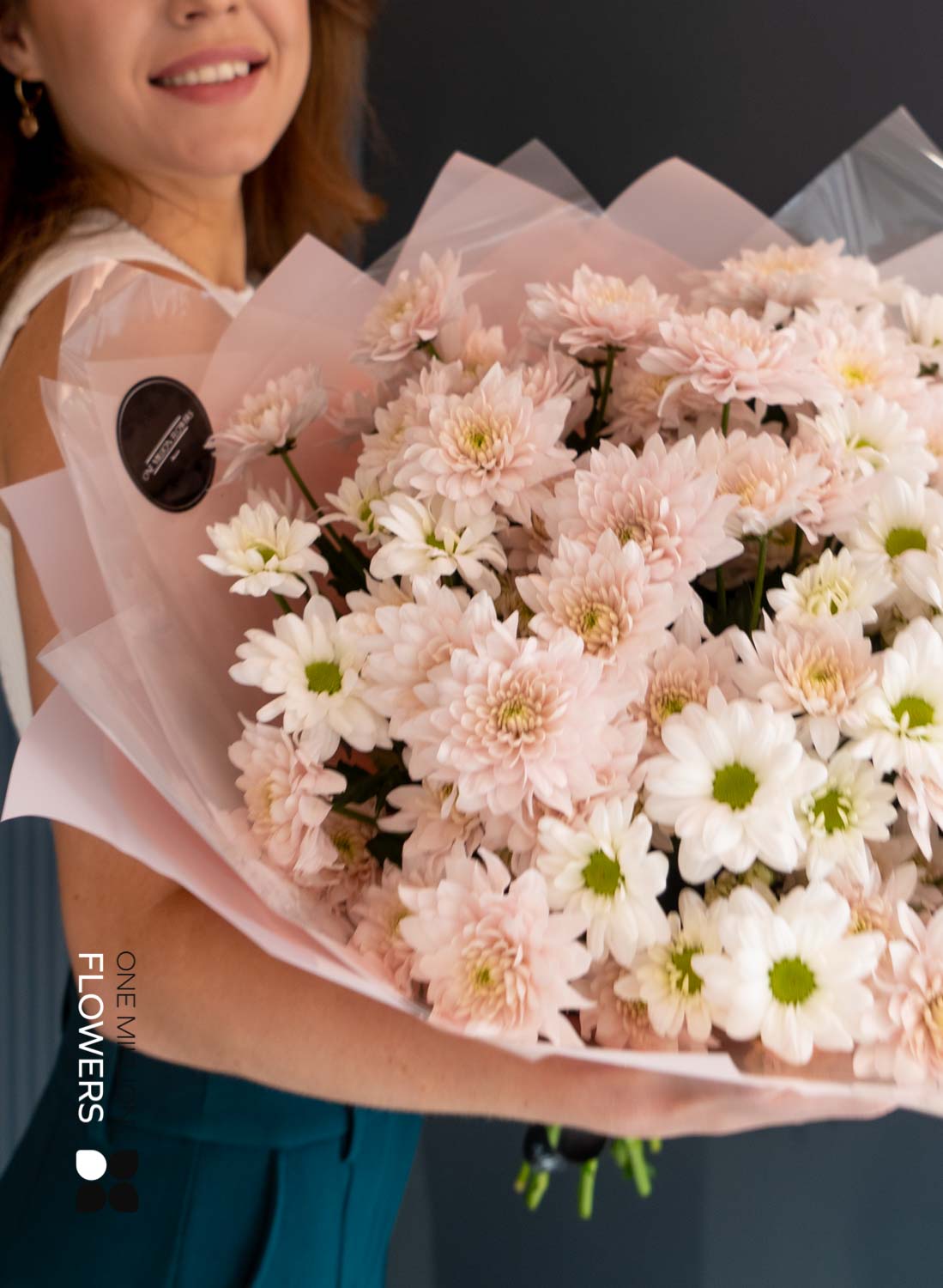 Букет "Сантини Палермо" Grand — это сочетание невероятной красоты и изысканности. В его составе вы найдёте 5 кустовых хризантем белого цвета и 10 кустовых хризантем розового. Эти цветы создают гармонию и наполняют букет свежестью, что делает его идеальным подарком для любого события.