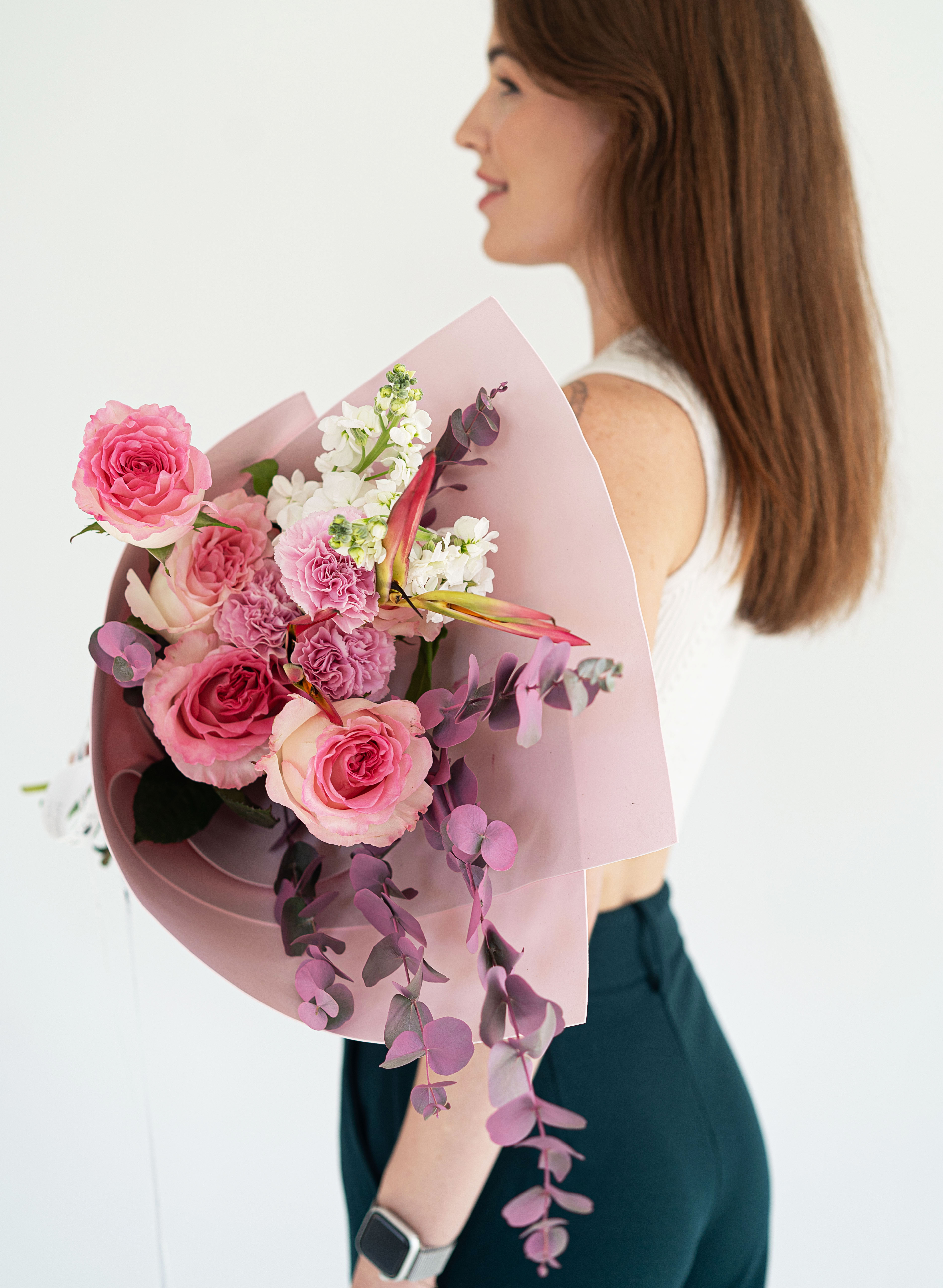 Роскошное сочетание цветов – теплые розовые оттенки гармонируют с белыми и зелеными акцентами, создавая нежный, но выразительный букет.