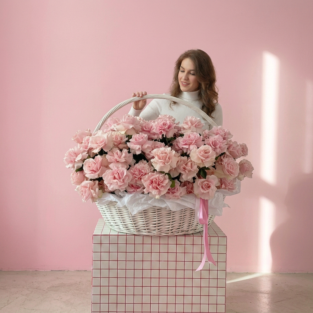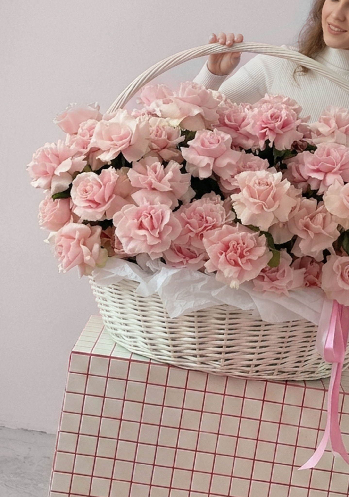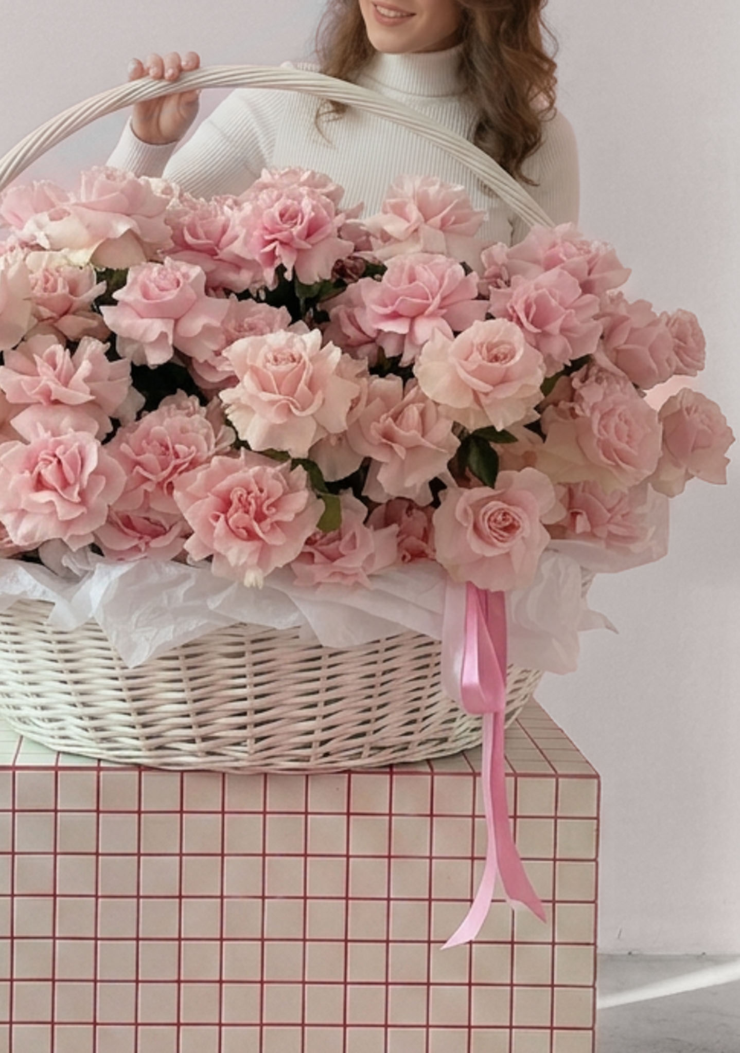 Корзина из 101 французской розы "Пинк Мондиаль"
