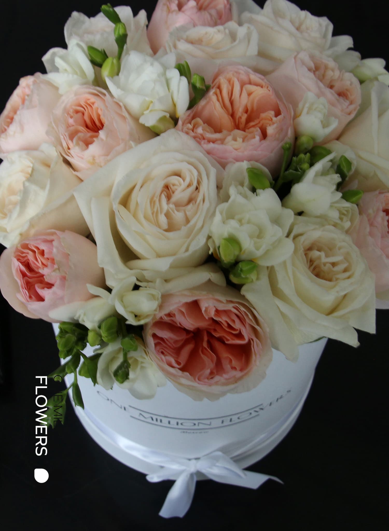 Коробка "Парма Джулия" White привлекает внимание своей элегантностью и утонченностью. Она наполнена прекрасными цветами, которые обязательно поднимут настроение. Пионовидные розы Вайт Охара и Девид Остин Джульетта, фрезия и стильная упаковка создают гармоничный ансамбль. Эти цветы в сочетании с коробкой сделают ваш подарок особенным и запоминающимся.