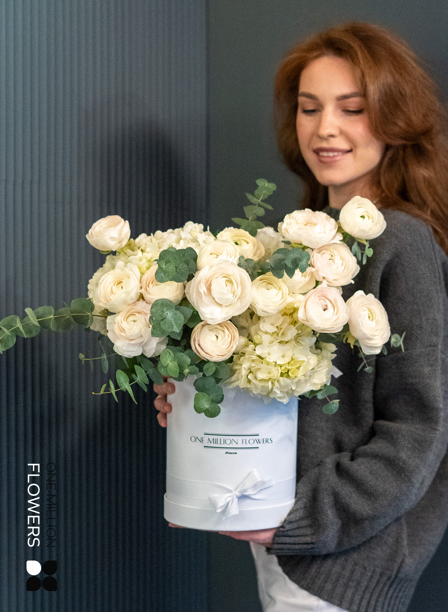 Каждая коробка содержит: 25 кремовых ранункулюсов, великолепные белые гортензии и свежий эвкалипт. Создавая этот букет, мы вложили душу и страсть к флористике, чтобы каждый элемент выделялся своей красотой. Ранункулюсы с их бархатистыми лепестками и гортензии с пышными снежными соцветиями создают атмосферу весеннего пробуждения, а эвкалипт добавляет нотку свежести и утонченности. Это идеальное сочетание цветов, которое позволит вам выразить свои чувства без слов.