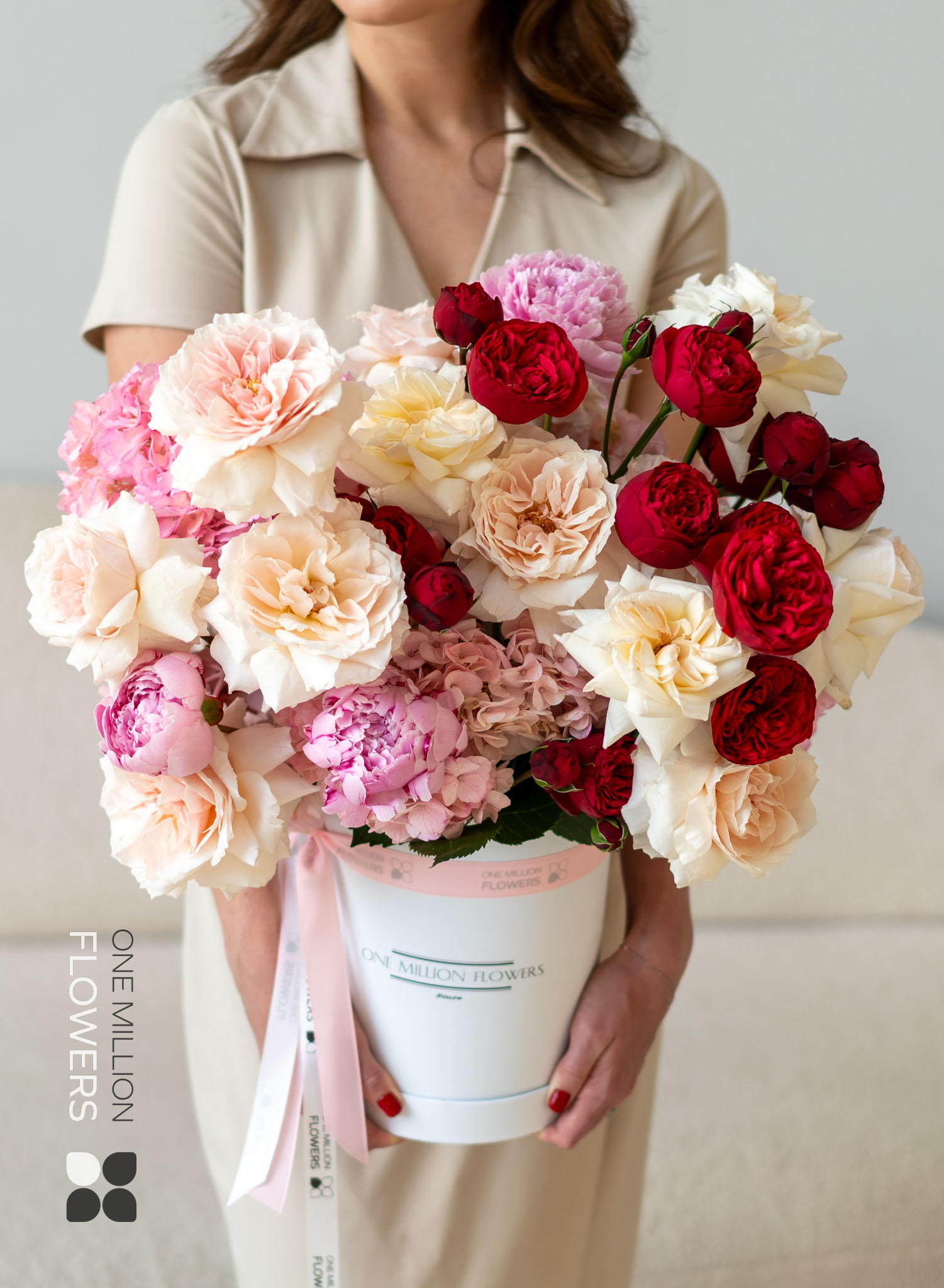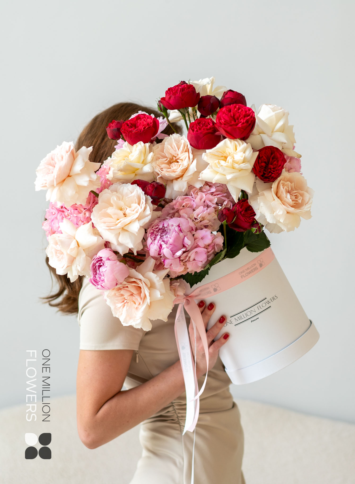 Элегантная цветочная коробка «Ровена» White — это гармоничное сочетание нежности и роскоши. В композиции собраны изысканные пионовидные розы «Вайт Охара» и «Тсумуги», благородные пионы розового оттенка, яркие пионовидные розы «Ред Пиано» и воздушная розовая гортензия. Их мягкие переходы цветов создают утонченную и стильную гамму, придавая букету особую нежность и объем. Оформленная в стильную белую коробку, эта композиция станет идеальным подарком на день рождения, годовщину или просто для того, чтобы выразить свою заботу и любовь.